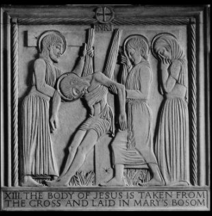 meets the women of Jerusalem 9.Christ falls the third time 10.Christ is stripped of his garments 11.The Crucifixion: Christ is nailed to the Cross 12.Christ dies on the Cross 13.Christ is taken down from the Cross 14.Christ is laid in the tomb. |