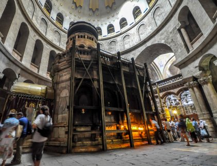 Something of a departure on the page - I'm going to focus on a twentieth century work of art, and suggest a musical accompaniment! But first a little background and, predictably, a trip to a favourite city in Italy. The Stations of the Cross is a sequence of usually fourteen images showing the events on Christ's journey with the cross through Jerusalem to Golgotha, the location of the crucifixion outside the city. Enter almost any Catholic church - and some Anglican ones - and you will find the fourteen stations set out round the nave of the church. These would usually be paintings, but can be sculptures or wall plaques. Following the stations around the church can be thought of as a 'virtual pilgrimage' to Jerusalem: perhaps 'spiritual journey' might be more appropriate. Doing that for real was only for a select few in early times. As with so much imagery of the Passion, the Stations of the Cross were developed by Franciscans: they developed them for real in Jerusalem itself. Having said that, the idea of replicating locations in Jerusalem went back even earlier. San Stefano, the complex of churches in Bologna, is traditionally said to have been founded in the fifth century to replicate the sacred sites in Jerusalem. The earliest part of the church, the rotunda of San Sepolchro, (left below) is clearly modelled on the church of the Holy Sepulchre, (right) though the Jerusalem church has been rebuilt many times over the centuries. The tomb in Bologna once contained the relics of St Petronius, founder of the church. |