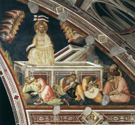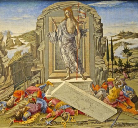 the rather humorous element. The second issue refers back to the rather off-hand comment I made at the top off the page. In the Benvenuto, Christ walks from the tomb; in the Bellini, he ascends into the sky. The distinction is perhaps more theologically significant than it first appears. The key to the Resurrection story is that Christ returns as a living man; this is the heart of the story of the meeting on the road to Emmaus. Christ is no ghost. Bellini's image is more suggestive of the Ascension, Christ as a spiritual rather that a physical being; Christ is literally risen. The two natures of Christ - Human and spiritual - is shown in various ways in art, but here shouldn't the human side be emphasised? The gospel stories can't help here - artists - or those commissioning the paintings - had to make up their own minds how the resurrection itself would be portrayed. Some more images |